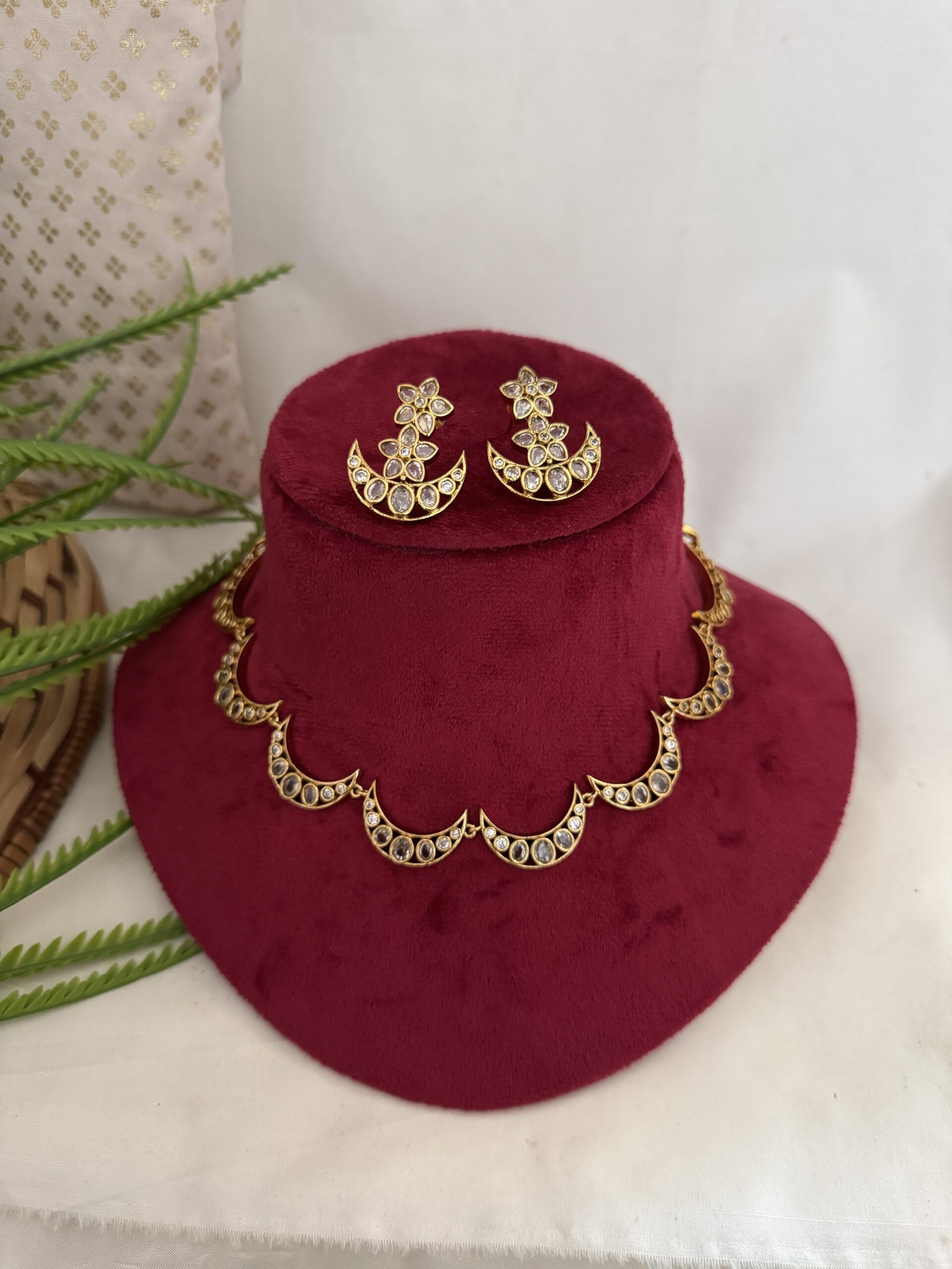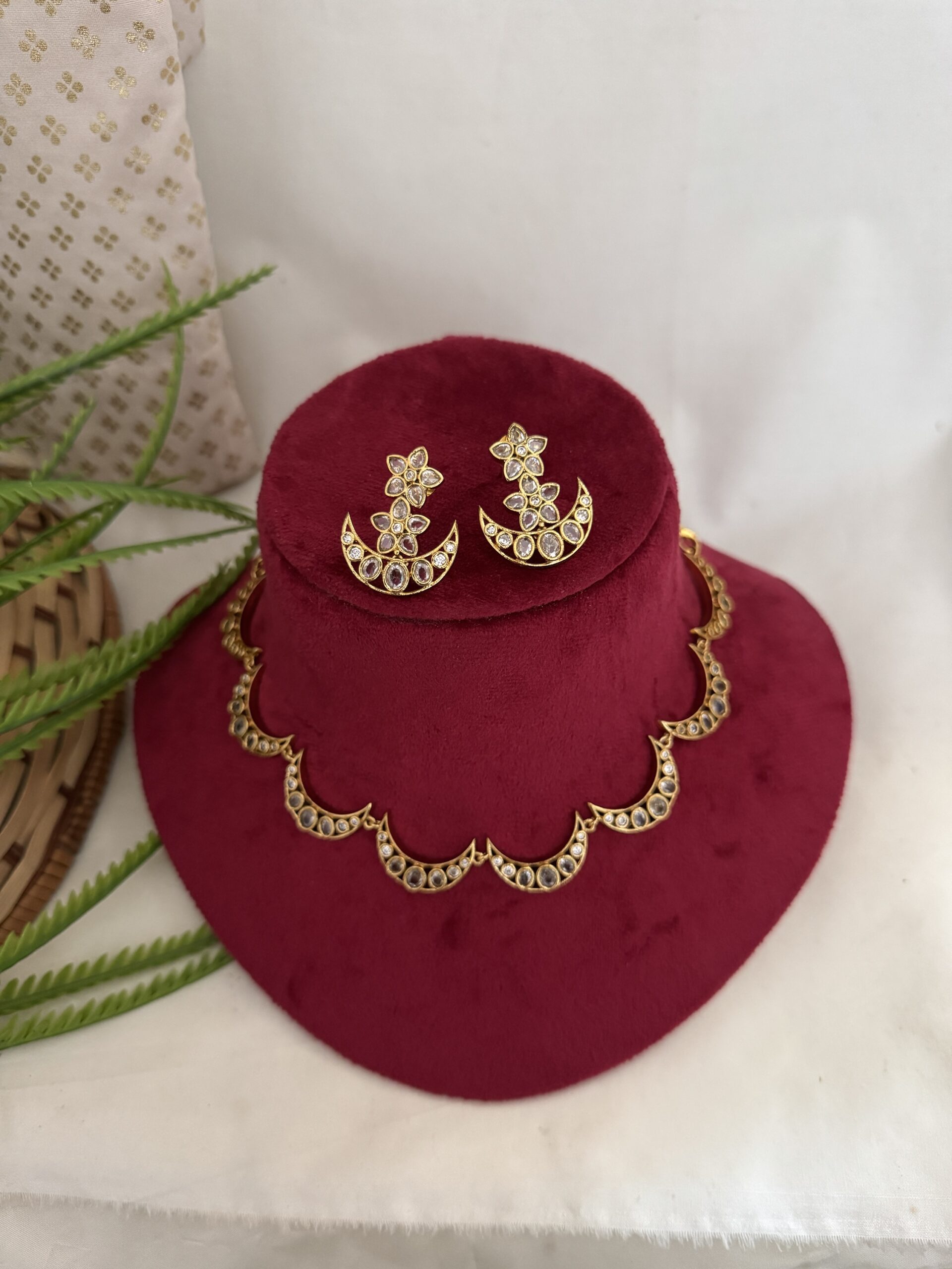 Turn heads and hearts with our Chandrika Sparkle Set – a crescent moon-inspired necklace set that blends elegance with a hint of divine charm. Perfect for festive looks, wedding guests, or statement party styling, this imitation jewellery gives you premium sparkle without the premium price!